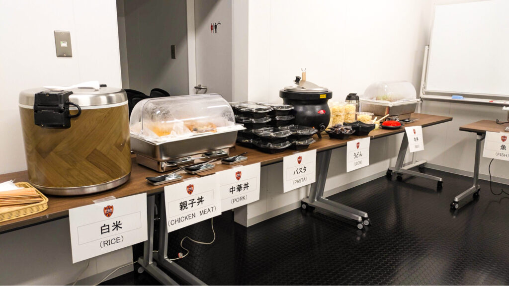選手ロッカーミールはケータリングスタイルでセッティングし、リカバリー促進として温かい食事も提供。選手が食べやすいよう提供方法も工夫して準備から回収までトータルサポートしています。