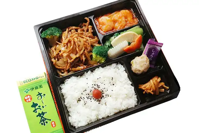 中国料理 新橋亭の特別弁当をお茶付きでご提供いたします。たっぷりの豚肉の甘辛炒めが食欲をそそります。ロケ弁や差し入れ弁当など、ご利用シーンに合わせてご注文ください。