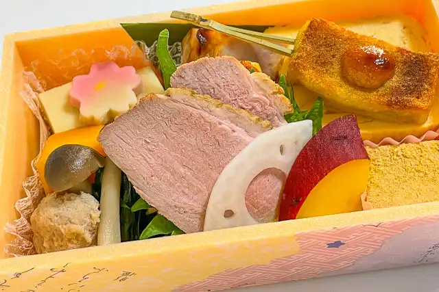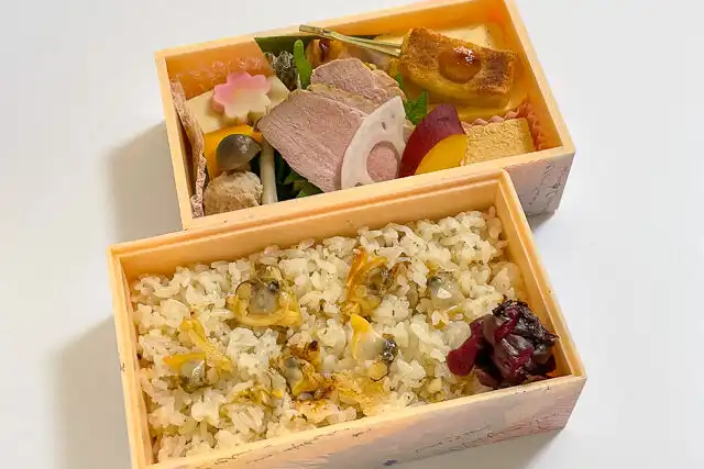 出し巻き玉子、鶏の幽庵焼き、合鴨ロース、旬野菜の炊き合わせなど、日本料理が詰まった小ぶりの二段弁当。ごはんは春限定「あさりの炊き込みごはん」です。ご飯は少なめが良い方におすすめです。