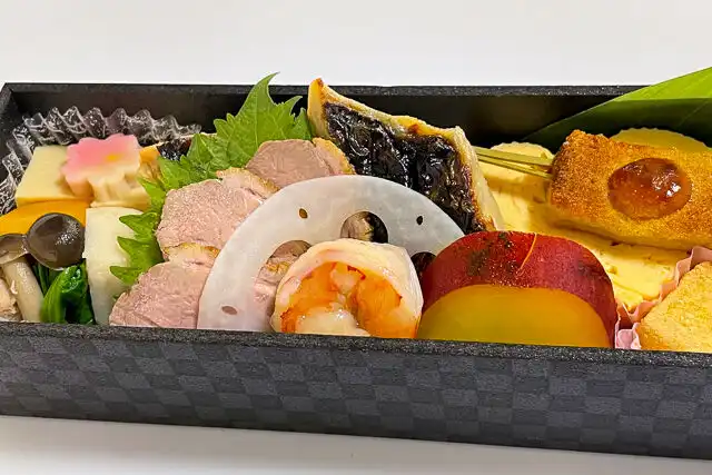 鶏もも肉幽庵焼き、さわらの西京焼き、合鴨ロース、海老の艶煮