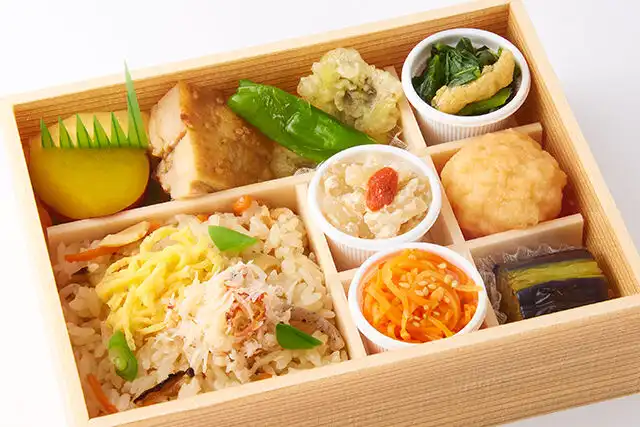 冬の五目ご飯に、ひと手間かけて作られたお惣菜の数々。「たか木」の出汁は、厳選された素材をたっぷり使用し、じっくりと時間をかけて丁寧にひくので一般的なものと比べてはるかに濃厚。海老の食感が残るように粗く刻み、特製の出汁と玉ねぎの甘みを加えた手作り「特製海老団子」はぷりっと食感よく味わいも絶品です。期間限定で味わう、冬のたか木懐石弁当をぜひご堪能ください。