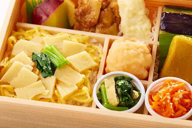 出汁巻き玉子、栂尾煮、若鶏の照り焼き、たけのこの天ぷら、茄子のオランダ煮、特製海老団子、粟麩の艶煮、青菜と揚げの煮浸し、人参金平