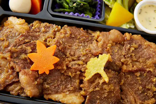 茨城が誇る常陸牛を大盛り100gという贅沢をどうぞ。厳しい審査を通ったブランド黒毛和牛・常陸牛のうまさを特製のたれが引き立てます。 お弁当専門店がこの一品のために厳選した肉質は、冷めてもやわらかい食感がお楽しみいただけます。副菜にはていねいに仕込んだ和食を盛り合わせています。煮物をはじめ、しっかりとした出汁をベースにしたお店手作りの味は、焼肉ファンだけでなく「和食幕の内」としてもご用命いただくほど評判です。焼肉x和食という、ありそうでなかった使い勝手の良いお弁当。「焼肉和食御膳」としてご用命ください。