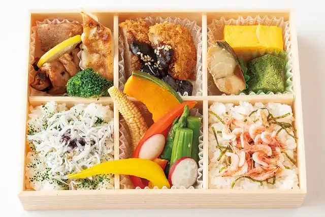しらす飯(110g)、桜えび飯(110g)、味噌カツ、浜松ぎょうざ、鶏旨辛焼き、グリル野菜、厚焼玉子、さば照焼き、抹茶わらび餅