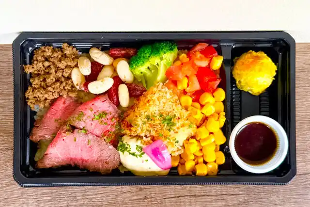 バターライス190g/ローストビーフ/白身魚のフライ/ブロッコリー/トマトサラダ/ビーンズ/タコスミート/かぼちゃサラダ