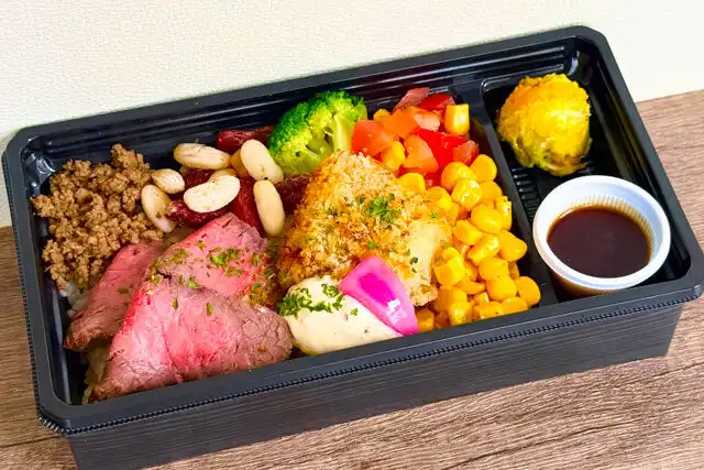 しっとりと仕上げた国産牛のローストビーフとサクサクの白身魚のフライを贅沢に盛り込みました。彩り豊かな副菜と共にお楽しみください。