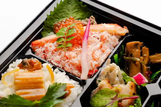 【ご飯部分】蟹めし80g(蟹棒、蟹フレーク、いくら、蟹味噌)、アサリめし80g(あなご、生姜等)【副菜1】黒毛和牛すき焼き、松茸出汁煮、卵黄ソース、トリュフ【副菜2】穴子南蛮漬け、スナップエンドウ、蓮根【おかず】季節の惣菜4種、鶏の柚子胡椒焼き、お新香