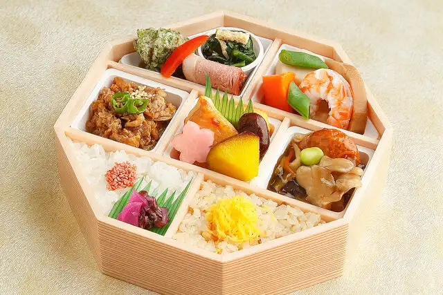 五目御飯(80g)〔筍、蒟蒻、人参、椎茸、油揚げ〕/錦糸玉子/白御飯(80g)/梅胡麻/刻みしば漬/鰈西京焼/厚焼玉子/丸十蜜煮/黒花豆/大根甘酢漬/合鴨燻製/蛸入りさつまあおさ揚げ/小松菜煮浸し/赤パプリカ/白子入り蟹つみれ/海老芝煮/六方里芋/蓮根田舎煮/人参/さや隠元/鶏つくね焼/ピリ辛甘酢餡(木耳、人参、筍)/茄子/舞茸/枝豆/牛肉香味焼(白胡麻)/玉葱/青唐