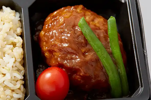 肉のスエヒロの手作りハンバーグ弁当を宅配弁当でご提供いたします。しっとりふっくら、じっくりと仕上げる手作りハンバーグを野菜など香り豊な本格デミグラスソースで煮込みました。ごはんは、粒立ちがよく甘めで粘りの少ない「こしいぶき」の白米と玄米、梅の酸味と塩味、かつおの香りが程よいと人気の梅かつおご飯の2種類からお選びください。自慢の手作り惣菜をはじめ、ボリュームも十分に盛り込んだお弁当です。会議や特別なお集まりなど、ご利用シーンに合わせて配達いたします。