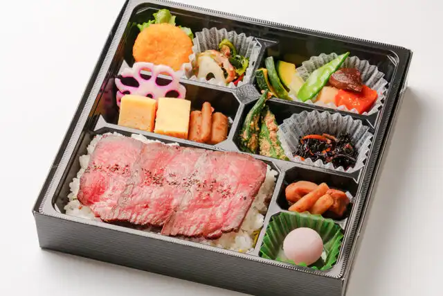 【ごはん】 白米140g、ローストビーフ 【おかず】 うま塩ナゲット、葉わさび漬け、筑前煮、南瓜の浅漬け、おくらの胡麻和え、玉子焼き、たらこのうま煮、酢蓮根、人参とひじきの煮物、ごぼうの梅漬け、甘味