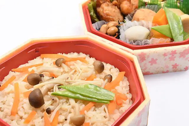 神戸 里家がご提供する宅配弁当。おすすめの華やか2段【季節の炊き込みご飯】をオフィスやご自宅でお楽しみください。季節の炊き込みご飯はだしの香りを効かせ、上品に仕上げました。おかずは、炊き込みご飯に合うよう、鰆の西京焼きや煮物をお入れしました。是非ご賞味ください。