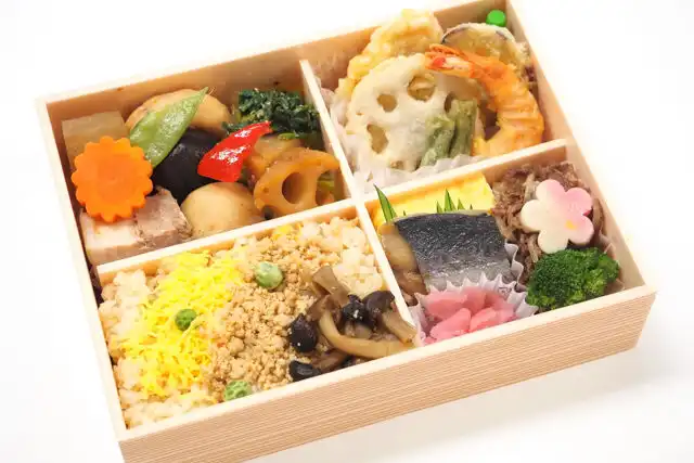 茶飯160g/とりそぼろ/錦糸玉子/しめじ煮/牛スキ煮/南瓜天/蓮根天/海老天/さつまいも天/いんげん天/里芋煮/花人参煮/がんもどき煮/大根煮/椎茸煮/豚角煮/鰆柚奄焼/厚焼玉子/蓮根きんぴら/春菊の胡麻和え/桜漬/ゆでブロッコリー/パプリカ/グリーンピース/その他付け合わせ