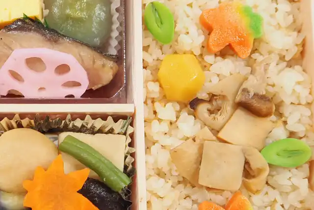 松茸ご飯240g/紅葉麩/栗の甘露煮/里芋煮/南瓜煮/椎茸煮/高野豆腐煮/揚げナス含ませ煮/紅葉人参煮/鳥蓮根天/海老天/パプリカ天/焼魚/厚焼玉子/アチャラ蓮根/しんじょしんびき揚/ゆでインゲン/さつま芋レモン煮/いかと海老の竹葉巻/イカ黄身焼と帆立煮の串打ち/抹茶葛/青ぎんなん