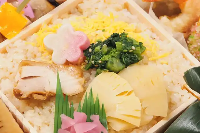 春の味覚竹の子や鶏煮焼などをトッピングした茶飯を中央に置き、周りに扇自家製の煮物や揚げ物、肉料理などをお洒落に詰め合わせました。少し贅沢に春を味わい、大事なお客様にお出ししたい、料理長おすすめの珠玉の一品です。