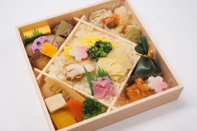 【ごはん】茶飯180g(錦糸玉子、竹の子、グリンピース、鶏煮焼、麩)/桜漬け/【おかず】厚焼玉子、/牛肉のアスパラ巻/イカの黄身焼、/帆立煮/揚げ物(エビボール天、竹の子しんじょしんびき揚げ、鶏蓮根天)/煮物(里芋、南瓜、竹の子、人参、高野豆腐)/竹葉巻/ロールキャベツ/その他付け合せ