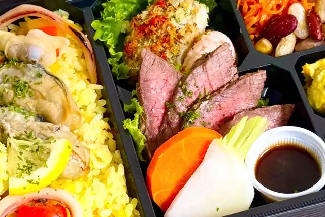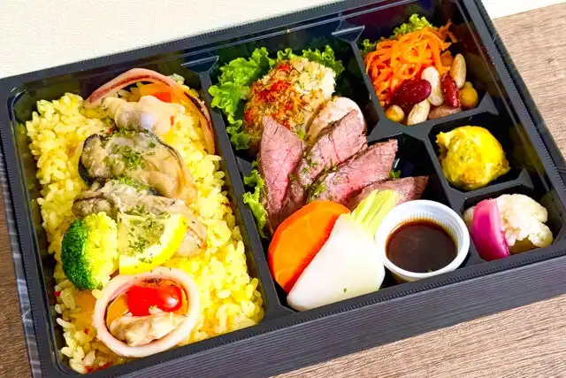 彩り豊かに旨みたっぷりの牡蠣を使ったパエリアに、赤身肉ステーキと白身魚の香草パン粉焼きをのせたWメインのお弁当です。栄養満点副菜と冬野菜もお楽しみください。