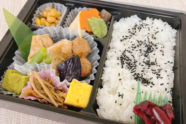 白飯200g(黒ごま 香物)/鶏の照焼 /インゲン/ 鶏肉串団子 /揚茄子 インゲン /玉子焼 /ゴボウと人参ピリ辛和え /抹茶わらび餅 /高野豆腐 / ピリ辛蒟蒻 /人参/ 絹さや /昆布煮豆