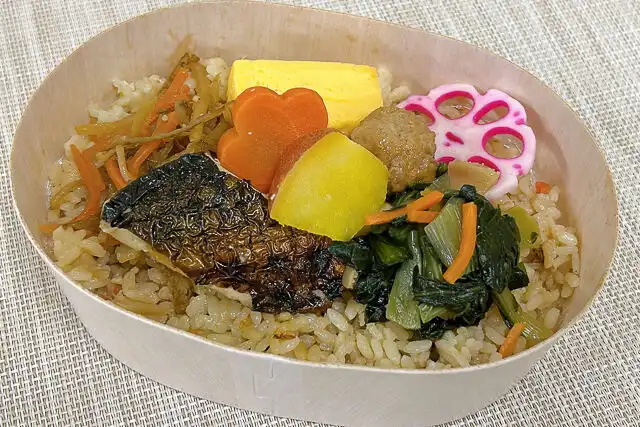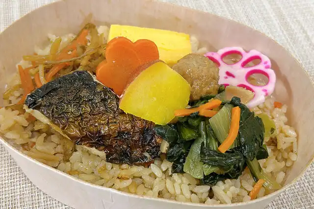 出汁茶飯200g /ゴボウと人参ピリ辛和え /鯖塩焼 /さつま芋甘露 /小松菜と人参のお浸し /玉子焼 /花人参 /鶏串団子 /花蓮根