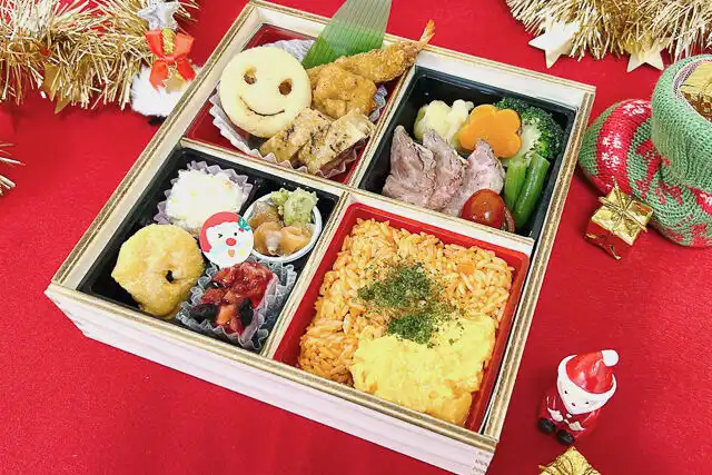 クリスマス限定のお弁当 演舞場のクリスマス膳をご用意いたしました。彩り華やかに盛り込まれた八寸にクリスマス限定バージョンのローストビーフとプチケーキにチキンオムライスと洋食をベースに仕上げました。クリスマス限定幕の内弁当をお楽しみください。
