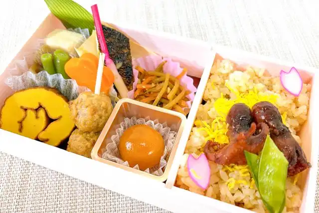 冬季限定(1月)で 睦月幕の内弁当をご用意いたしました。旬の食材【煮タコ】は香りと味わい深く出汁茶めしの味わいは抜群です。1月限定の祝い折詰弁当をお楽しみください。