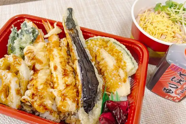 〈春季限定〉4月末まで 演舞場の天重とちょい桜そばをご用意いたしました。春の食材の天重と旬の桜そばのお弁当と贅沢盛りです。食人により受け継がれた伝統のタレで仕上げた天重をお楽しみください。