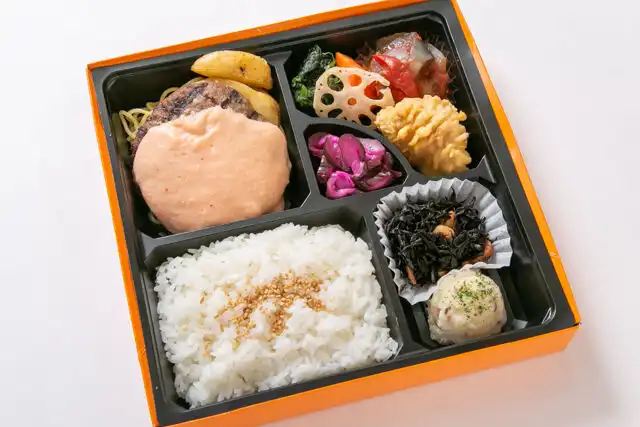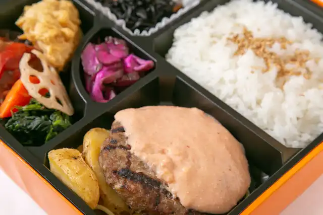 大人気の牛肉100%直火網焼きステーキハンバーグに副菜が色とりどりのスペシャル弁当登場。季節限定の明太子クリームソースでお届け。春、桜色の色鮮やかなピンクのソースが穏やかな気持ちにさせてくれます。