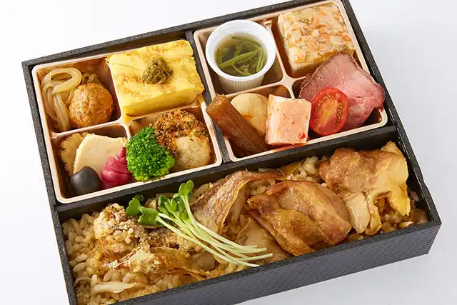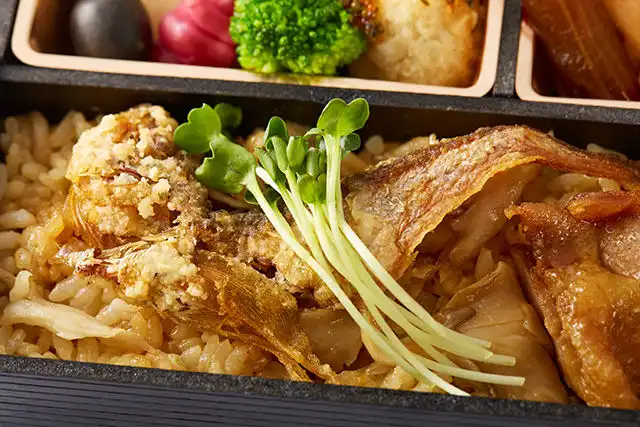 秋田名物鰰(ハタハタ)の唐揚げと比内地鶏の照り焼きを舞茸ご飯の上に乗せた豪華ごはん。副菜には名物いぶりがっこや食感が楽しいチョロギ、つるりとした喉ごしがたまらないじゅんさいなどの秋田名物を詰め込みました。秋田を感じられる品々とご一緒にお楽しみください。