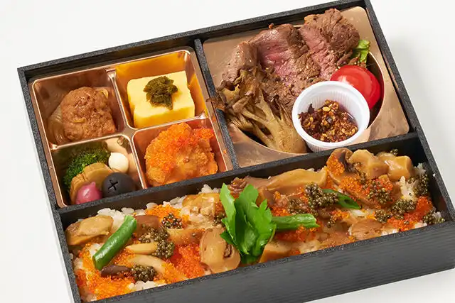 /ポルチーニ入りキノコ炊き込みと8種惣菜の熟成牛ランプステーキ弁当