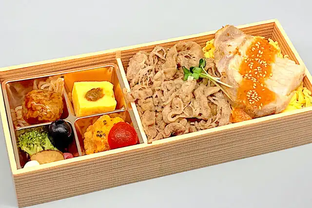 十和田牛バラ焼き、豚ロース、秋田味噌の甘辛タレ、錦糸玉子