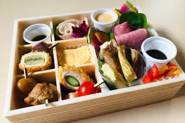 当店の人気、おすすめのお料理を彩り華やかに杉色の折箱につめた、おひとり様用のオードブル。看板メニューの鶏肉料理と玉子焼きはリピーターに指示される一品。オードブルといえばローストビーフ、お肉をしっかり堪能できる味です。旬の野菜と食べられるお花が更に見た目を楽しませてくれます。