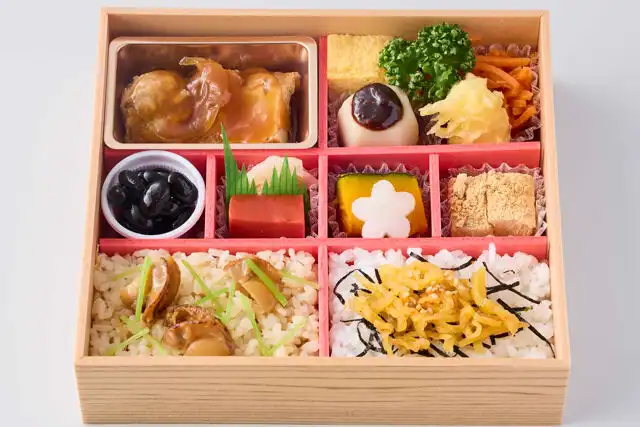 ベビーホタテ旨煮のせ生姜ごはん90g/沢庵金平のせ白ごはん90g/特製鶏団子と玉葱と豆腐のすき焼き風/出汁巻玉子/アンコウの天ぷら/里芋煮田楽味噌/人参きんぴら/パセリ/黒豆/れんこん梅肉和え/赤蒟蒻/南瓜煮/梅大根甘酢漬け/甘味