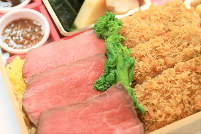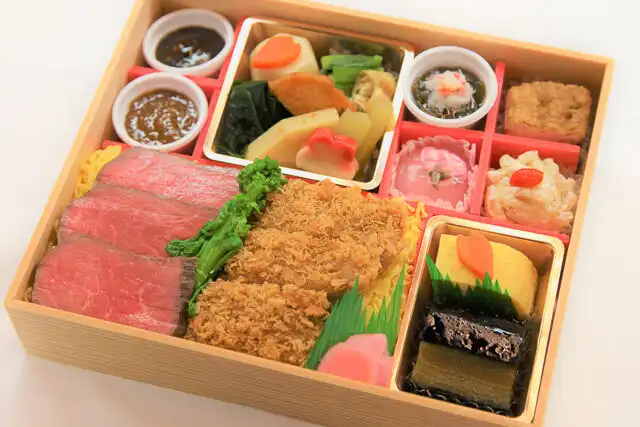 【ごはん】白ご飯180g、飛騨牛ローストビーフ、飛騨牛味噌カツ、錦糸玉子、菜の花わさび和え、香の物 【おかず】六方里芋、花びら人参、小松菜お浸し、若竹煮、ふき、木の芽、さつま揚げ、花麩、もずく酢、カニ身、厚揚げ煮、こんにゃく白和え、クコの実、さくらさくら(甘味)、出汁巻玉子、茄子のオランダ煮