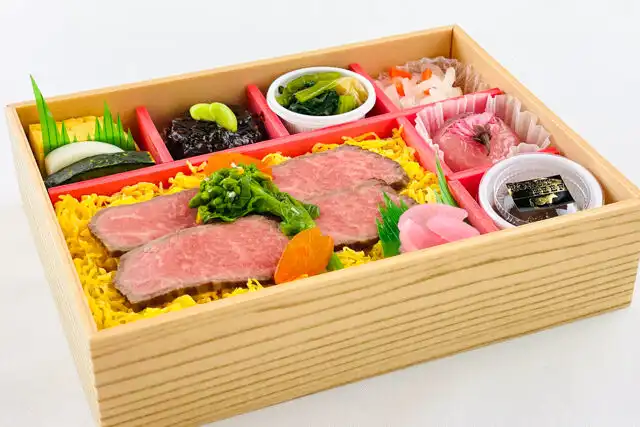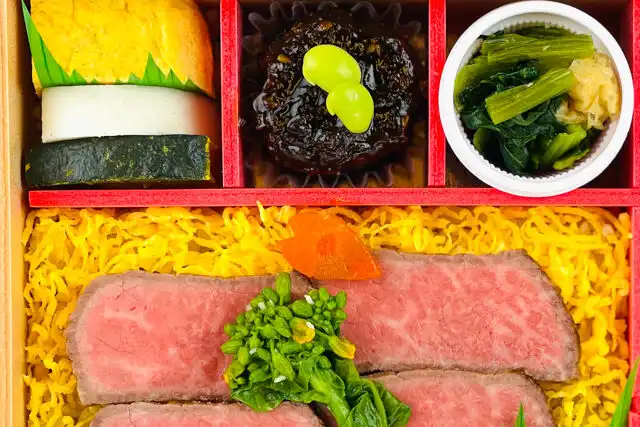 【ごはん】 生姜ごはん200g、飛騨牛ローストビーフ、錦糸玉子、菜の花わさび和え、花びら人参、香の物 【おかず】出汁巻玉子、蒲鉾、南瓜、茄子のしぎ焼き、枝豆、小松菜お浸し、なます、甘味