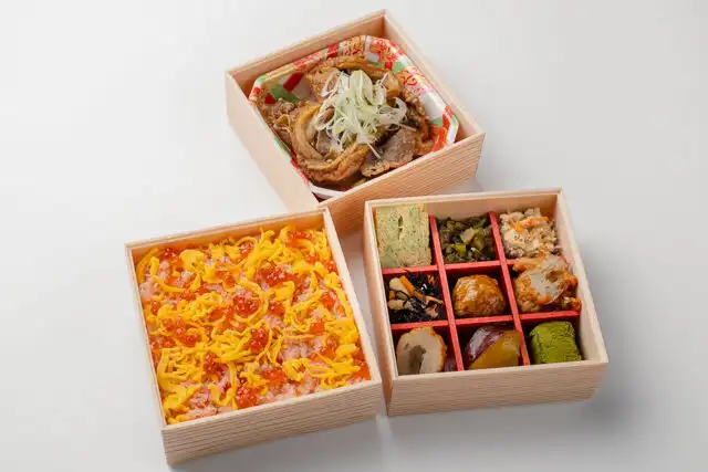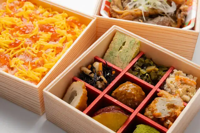えびす あふそやの五目ちらし寿司と彩り9升の三段弁当を宅配弁当でご提供いたします。ふわふわ玉子そぼろに華やかなえびをあしらい、鶏もも肉の照り焼きを添えたあふそや風五目ちらし寿司と、あふそやこだわりの沖縄麩を共に炊き上げた牛すき煮を添えて三段仕立てにした、会席風のおもてなし膳です。沖縄料理がベースのあふそやならではの沖縄アーサー(青海苔)入りの玉子焼きも添えました。さらに、オリジナルの豆乳コロッケはひとつひとつ手作り。ロケ弁や特別なお集まりなど、ご利用シーンに合わせてご注文ください。