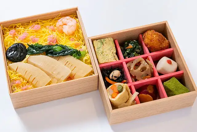 春の食材「筍」を使った季節の五目ちらし寿司と、彩り鮮やかな9升のおかずの二段おもてなし膳です。