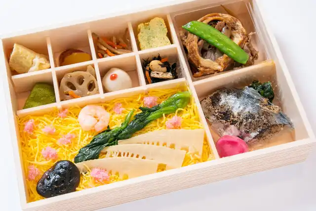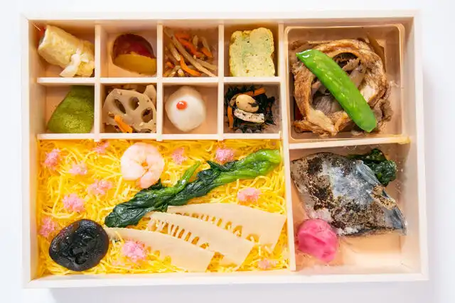 筍ちらし寿司(酢飯約180g、筍、海老、椎茸、錦糸玉子、菜の花、桜でんぶ)/牛煮込み(玉ねぎ、牛肉、沖縄車麩、さやえんどう)/アーサーだし巻き玉子/人参とセロリのきんぴら/さつま芋甘煮/野菜の油揚げ巻/ひじきの煮物/里芋の梅肉のせ/れんこんとごぼうの甘辛煮/わらび餅/選べるメイン(鰆の西京焼き・ごぼうつくねハンバーグ)/鰆の西京焼きの場合(ほうれん草の胡麻和え/赤かぶ甘酢漬け)/ごぼうつくねハンバーグの場合(キノコ/柚子/グリンピース)