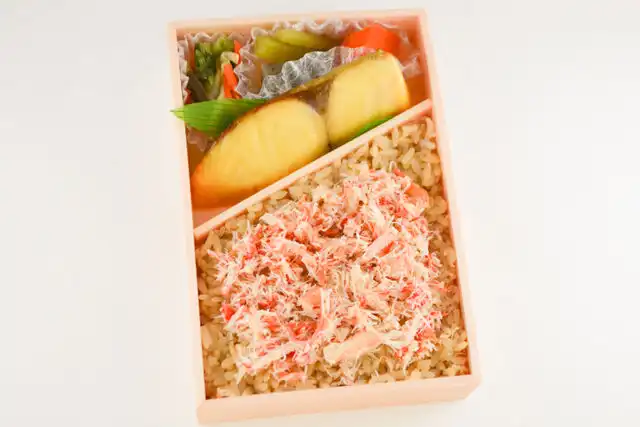 かにめし140g/紅ずわい蟹煮/銀ひらす西京焼/煮物(こんにゃく、人参、ふき)/姫皮竹の子と野沢菜のお浸し