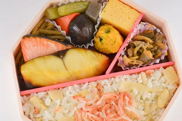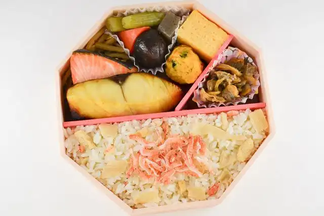 香ばしい桜えびと食感の良い竹の子を炊込んだ炊込みご飯のお弁当です。焼魚は炊込みご飯と相性抜群の、脂乗りが良い銀ひらすの西京焼と銀鮭の塩焼の2種類が入ります。蓋を開けるとふわっと香る、桜えびの香りをお楽しみ下さい。
