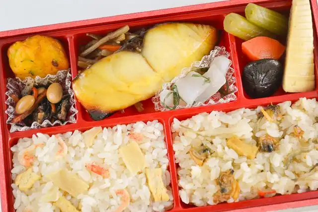 桜えび竹の子ごはん80g/あさりと牛蒡の炊込みご飯80g/銀ひらす西京焼/かぼちゃボール/ひじき当座煮/きんぴら牛蒡/柚子香こんにゃく/煮物(竹の子、人参、椎茸、ふき)