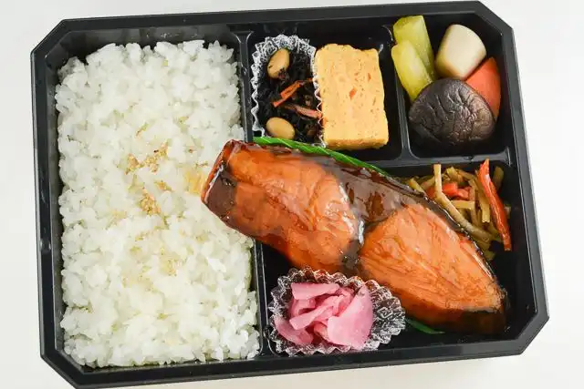 白飯(白ごま)190g/羅臼産天然ぶり照焼/きんぴら牛蒡/玉子焼/ひじき当座煮/煮物(椎茸、人参、里芋、ふき)/さくら大根
