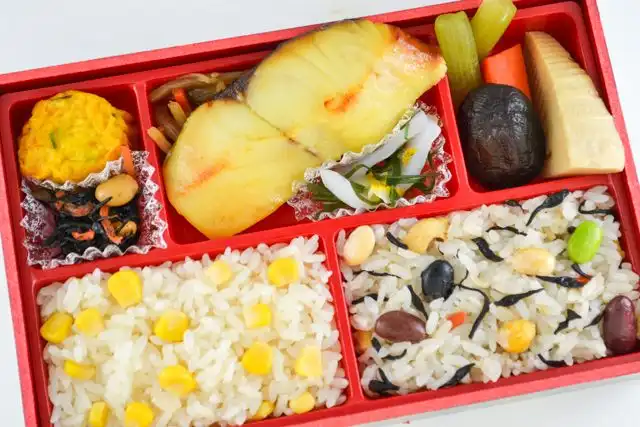 脂乗りのよい銀ひらすを西京焼にしました。季節によって変わる2種類のごはんと和のおかずを詰め合わせた、冷めても美味しい味の浜藤を代表する人気のお弁当です。ご飯はとうもろこしごはんと、ひじきと豆を炊込んだヘルシーなご飯が入ります。ご飯の量目は2種類合わせて約160gです。