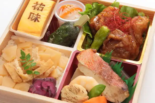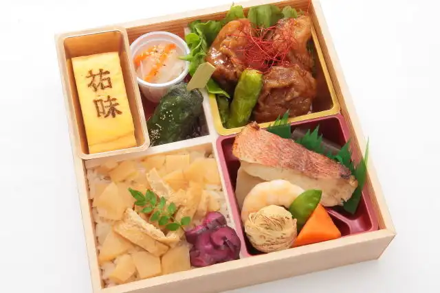 甘酸っぱくて癖になる特製黒酢鶏南蛮をメインに、赤魚山椒焼きを盛り込みました。祐味の焼き印が入った出汁巻玉子も自慢のひと品です。