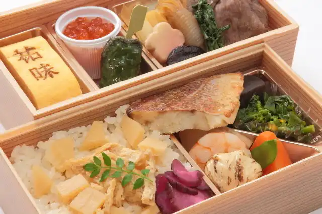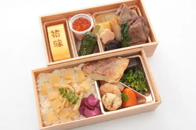特製の牛すき焼きをメインに、赤魚山椒焼きを盛り込みました。祐味の焼き印が入った出汁巻玉子も自慢のひと品です。