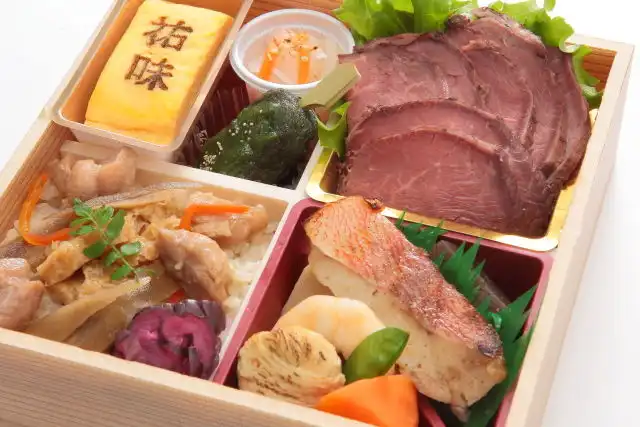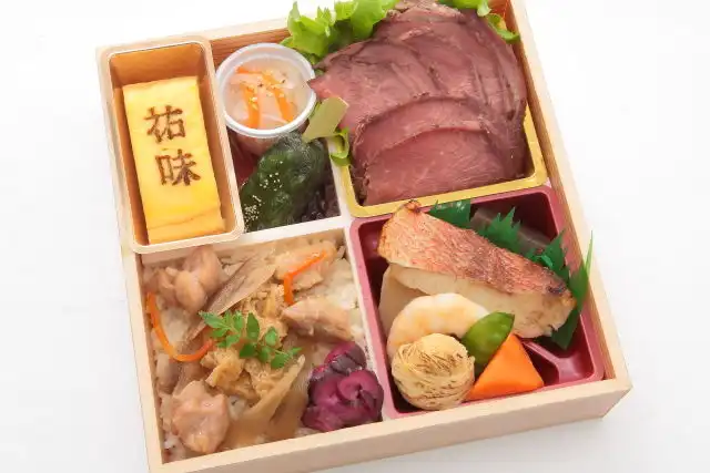 特製のローストビーフをメインに、赤魚山椒焼きを盛り込みました。祐味の焼き印が入った出汁巻玉子も自慢のひと品です。