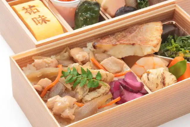 いくら、生麩田楽や紫豆、焼き手まり湯葉の含め煮など、こだわりの副菜もお楽しみください。ご飯は、冬の香りを感じる鶏ごぼうご飯を用意しております。