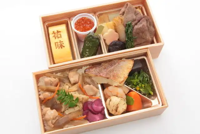 特製の牛すき焼きをメインに、赤魚山椒焼きを盛り込みました。祐味の焼き印が入った出汁巻玉子も自慢のひと品です。