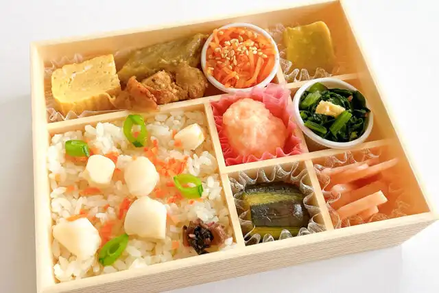 貝柱の炊き込みご飯130g、貝柱、人参、絹さや、漬物