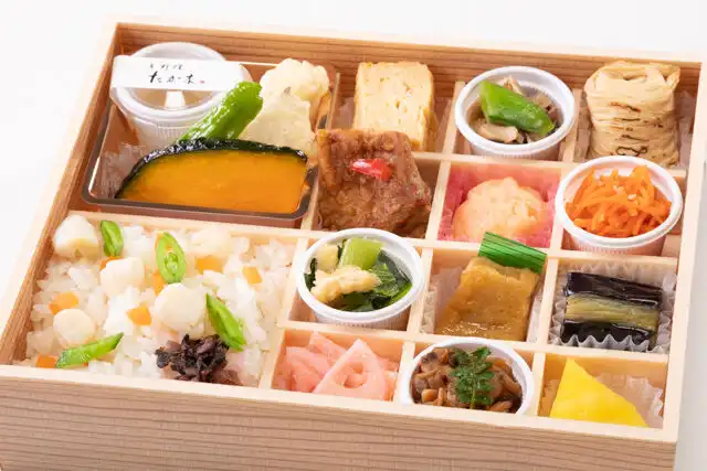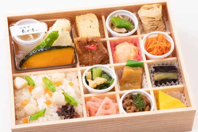 「たか木」特製の出汁あんで頂く「カレイと穴子の揚げ出し」のほか、名店「たか木」の味わいを楽しめる全13種のお料理御膳です。丁寧に枡目に詰められたこだわり惣菜に、ご飯は貝柱ならではの深い味わいが楽しめる炊き込みごはんに仕上げています。「たか木」の出汁は厳選された素材をたっぷり使用し、じっくり時間をかけてひくので一般的なものと比べてはるかに濃厚。「特製海老団子」は食感を残した海老と玉ねぎの甘みに出汁が相まって絶品です。