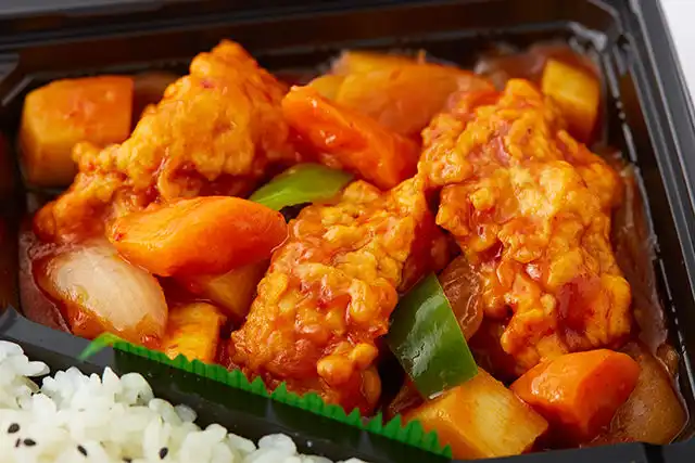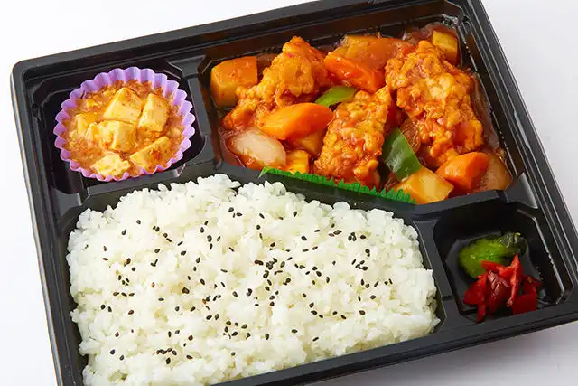 香菜屋~かなや~のWメイン中華弁当(黒酢の酢鶏&チンジャオロース)が宅配弁当でお楽しみいただけます。中国の酢の名産地「鎮江」出品の長期発酵・熟成の黒酢をたっぷり入れて、疲労回復、健康志向の方に必見です。柔らかい鶏肉を黒酢でさっぱりと仕上げたヘルシーな一品の「黒酢の酢鶏」と、タケノコとピーマンのシャキシャキとした食感を楽しめる青椒肉絲(チンジャオロース)のダブルメイン中華弁当です。副菜にはごはんが進むピリ辛味の麻婆豆腐もご用意しております。会議やご家族でのお集まりなど、ご利用シーンに合わせてデリバリーいたします。