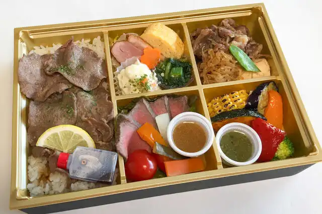 店主おすすめのご飯の上に牛タンをのせた牛タン重のお弁当です。おかずに、手作りローストビーフ、味がしっかりしみ込んだすき焼きのダブルメイン。女性に人気のバジルドレッシングを温野菜にかけてお召し上がりください。